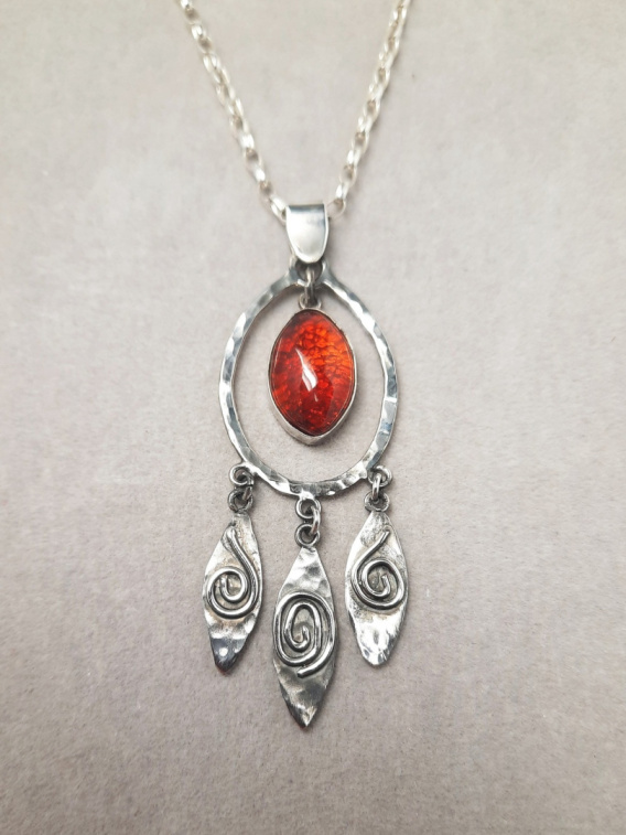 Ten wyjątkowy, ręcznie wykonany przeze mnie wisiorek to prawdziwe dzieło sztuki, łączące w sobie elegancję srebra z naturalnym pięknem bursztynu. Centralnym elementem wisiorka jest piękny, owalny bursztyn o intensywnej, głębokiej, ciepłej barwie, który zdobi srebrna oprawa o delikatnie młotkowanej fakturze, dodającej całości unikalnego charakteru. Z okrągłej ramy zwisają trzy ozdobne elementy w kształcie listków, również wykonane ze srebra, z finezyjnymi spiralnymi wzorami, które nadają wisiorkowi harmonijną i artystyczną formę.